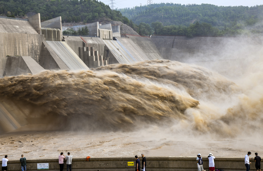 7月4日,游客觀看黃河小浪底水庫(kù)排沙出庫(kù)。