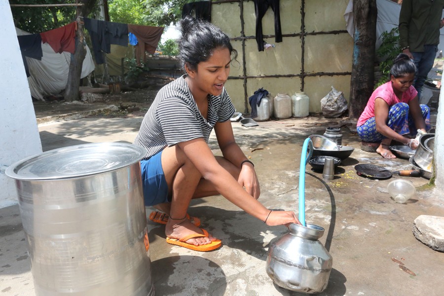 6月22日,女孩在印度中央邦博帕爾戈拉村通過(guò)水管打水。