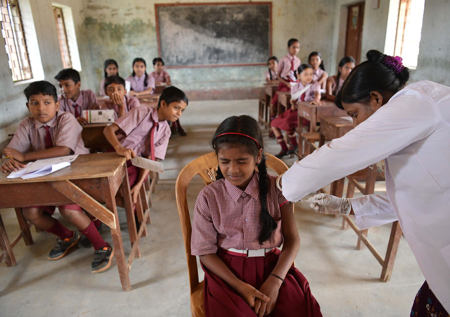 7月5日,在印度阿加爾塔拉一所學(xué)校,學(xué)生接種新冠疫苗。