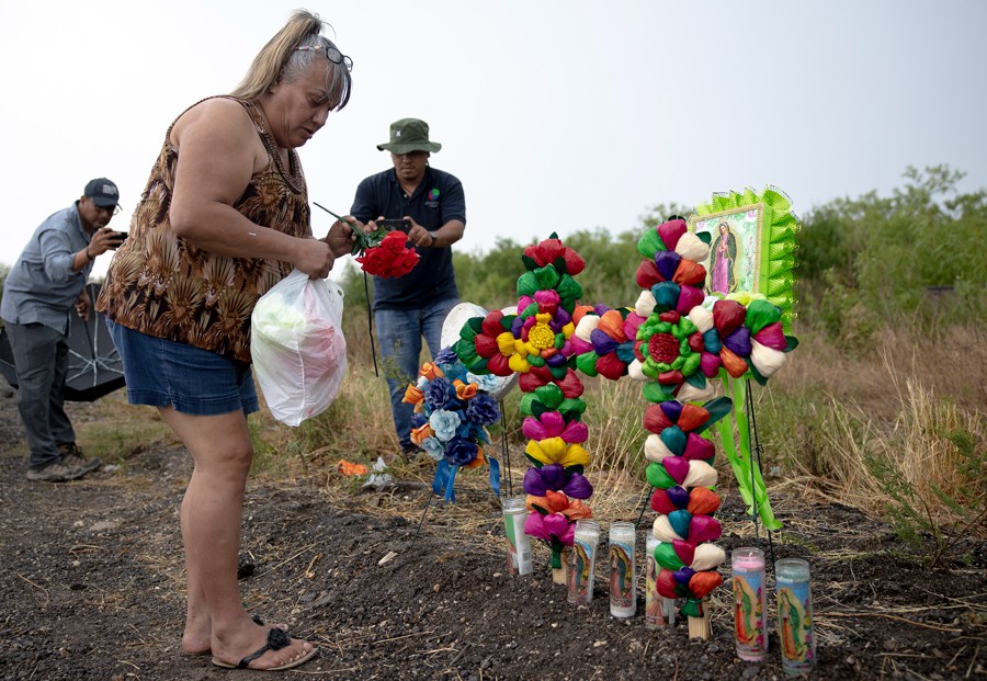6月28日,一名女子在美國(guó)得克薩斯州圣安東尼奧市貨車慘案現(xiàn)場(chǎng)擺放塑料花束。