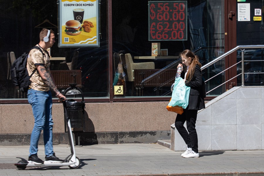 6月29日,在俄羅斯首都莫斯科,行人經(jīng)過一處外匯兌換點(diǎn)的匯率顯示屏。