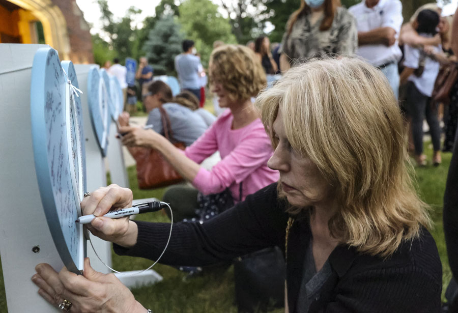 7月5日,在美國伊利諾伊州海蘭帕克市,人們書寫留言悼念“獨立日”槍擊案遇難者。