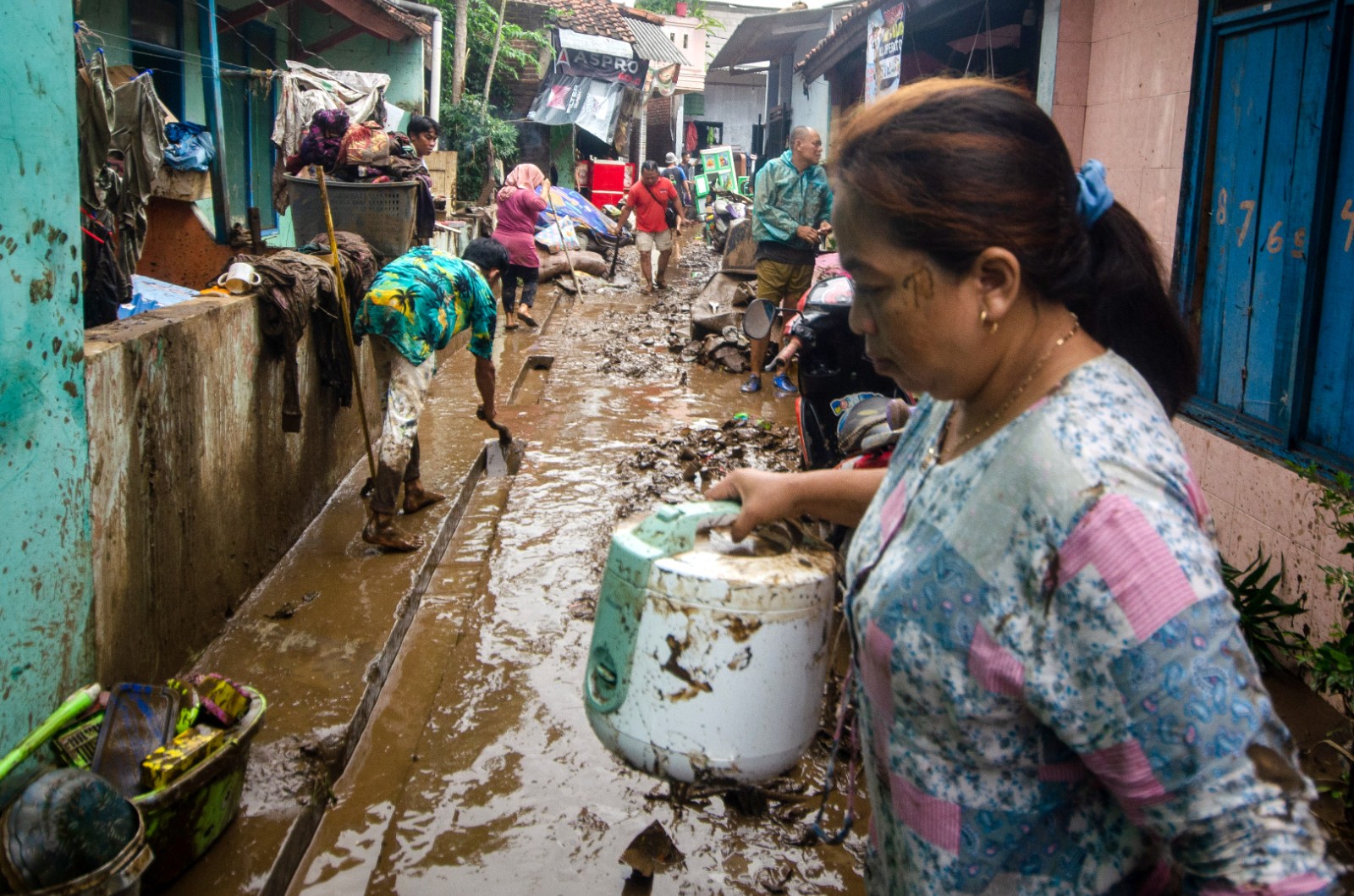 7月16日,在印尼西爪哇省加魯特,當?shù)鼐用袂謇肀缓樗忠u的房屋。