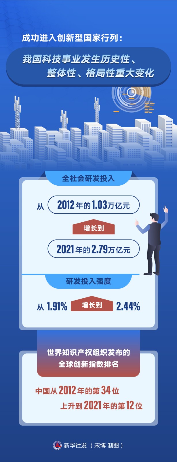 全社會研發(fā)投入從2012年的1.03萬億元增長到2021年的2.79萬億元,研發(fā)投入強(qiáng)度從1.91%增長到2.44%;世界知識產(chǎn)權(quán)組織發(fā)布的全球創(chuàng)新指數(shù)排名,中國從2012年的第34位上升到2021年的第12位……