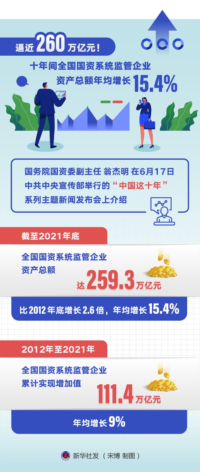 國務院國資委副主任翁杰明在6月17日中共中央宣傳部舉行的“中國這十年”系列主題新聞發(fā)布會上介紹,截至2021年底,全國國資系統(tǒng)監(jiān)管企業(yè)資產(chǎn)總額達259.3萬億元,比2012年底增長2.6倍,年均增長15.4%;2012年至2021年,全國國資系統(tǒng)監(jiān)管企業(yè)累計實現(xiàn)增加值111.4萬億元,年均增長9%。