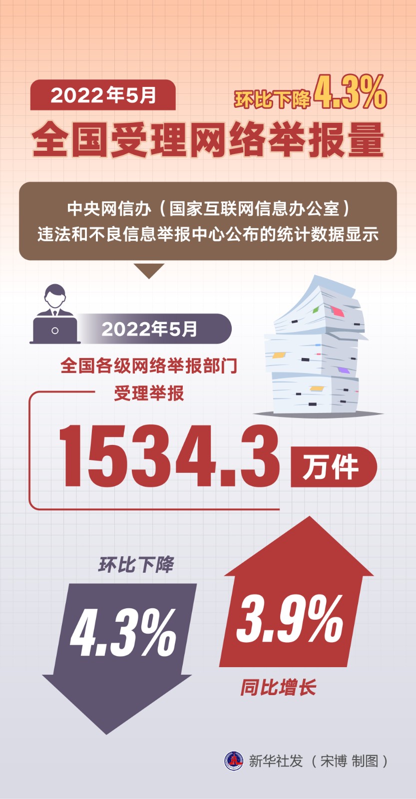 中央網(wǎng)信辦(國家互聯(lián)網(wǎng)信息辦公室)違法和不良信息舉報(bào)中心公布的統(tǒng)計(jì)數(shù)據(jù)顯示,今年5月,全國各級(jí)網(wǎng)絡(luò)舉報(bào)部門受理舉報(bào)1534.3萬件,環(huán)比下降4.3%、同比增長3.9%。