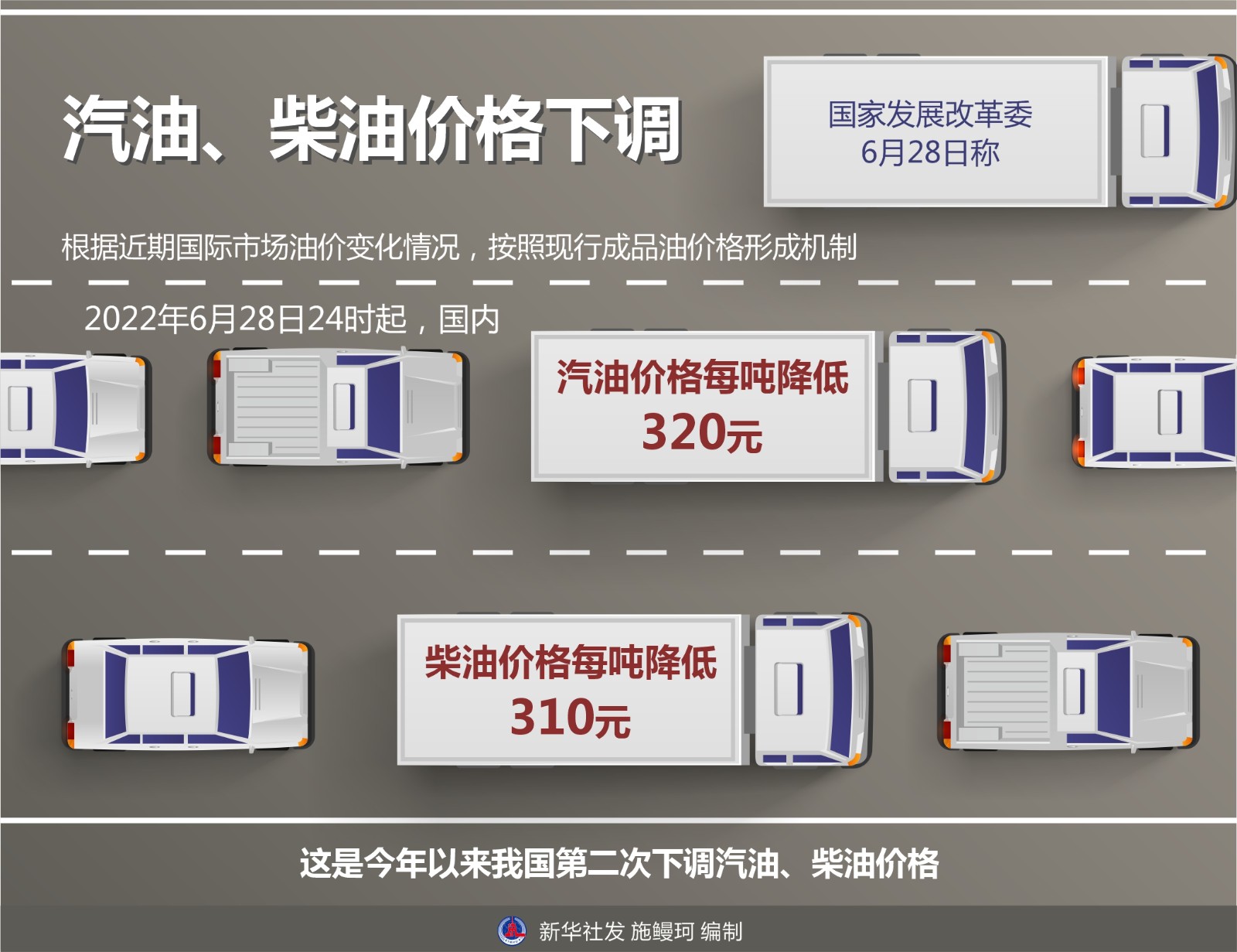 國家發(fā)展改革委6月28日稱,根據(jù)近期國際市場油價變化情況,按照現(xiàn)行成品油價格形成機制,自2022年6月28日24時起,國內(nèi)汽油、柴油價格每噸分別降低320元和310元。