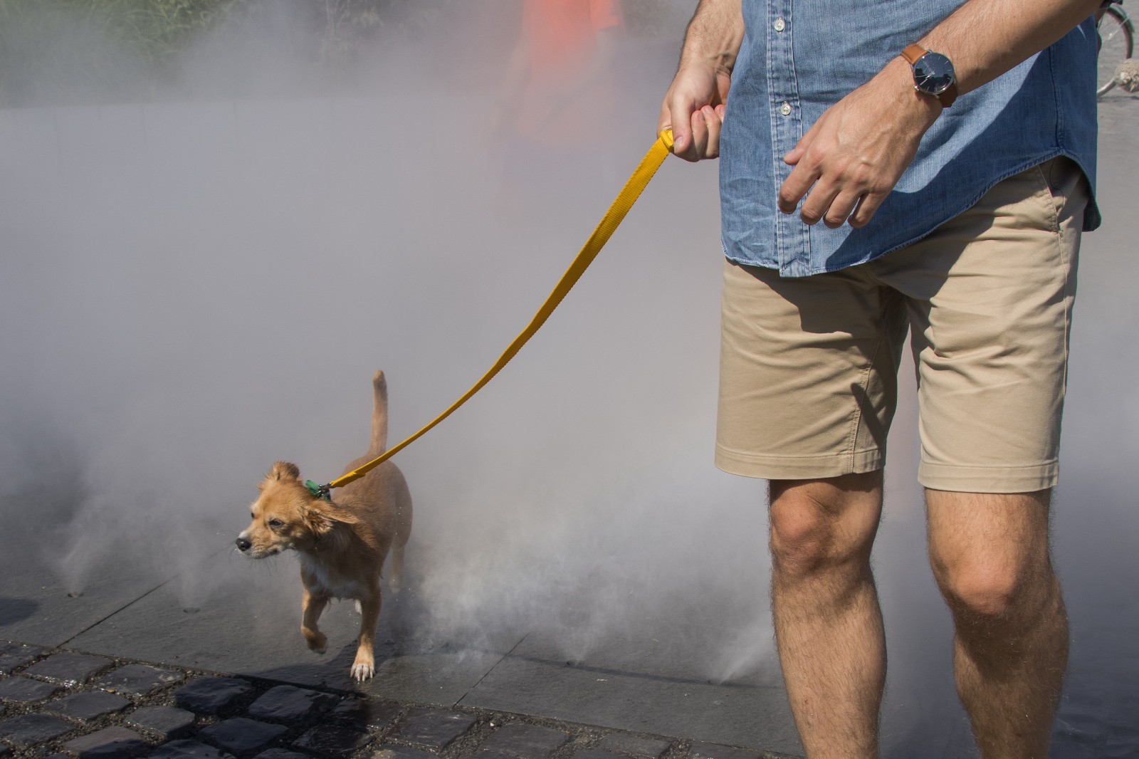 7月19日,在匈牙利布達(dá)佩斯,一條小狗和它的主人在一處公共加濕設(shè)施享受清涼的噴霧。