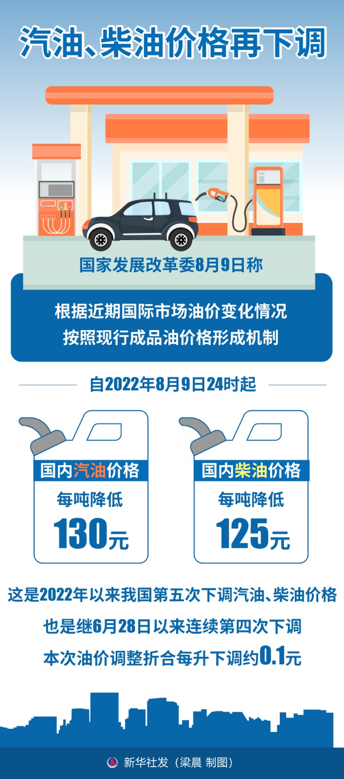 國(guó)家發(fā)展改革委8月9日稱(chēng),根據(jù)近期國(guó)際市場(chǎng)油價(jià)變化情況,按照現(xiàn)行成品油價(jià)格形成機(jī)制,自2022年8月9日24時(shí)起,國(guó)內(nèi)汽油、柴油價(jià)格每噸分別降低130元和125元。