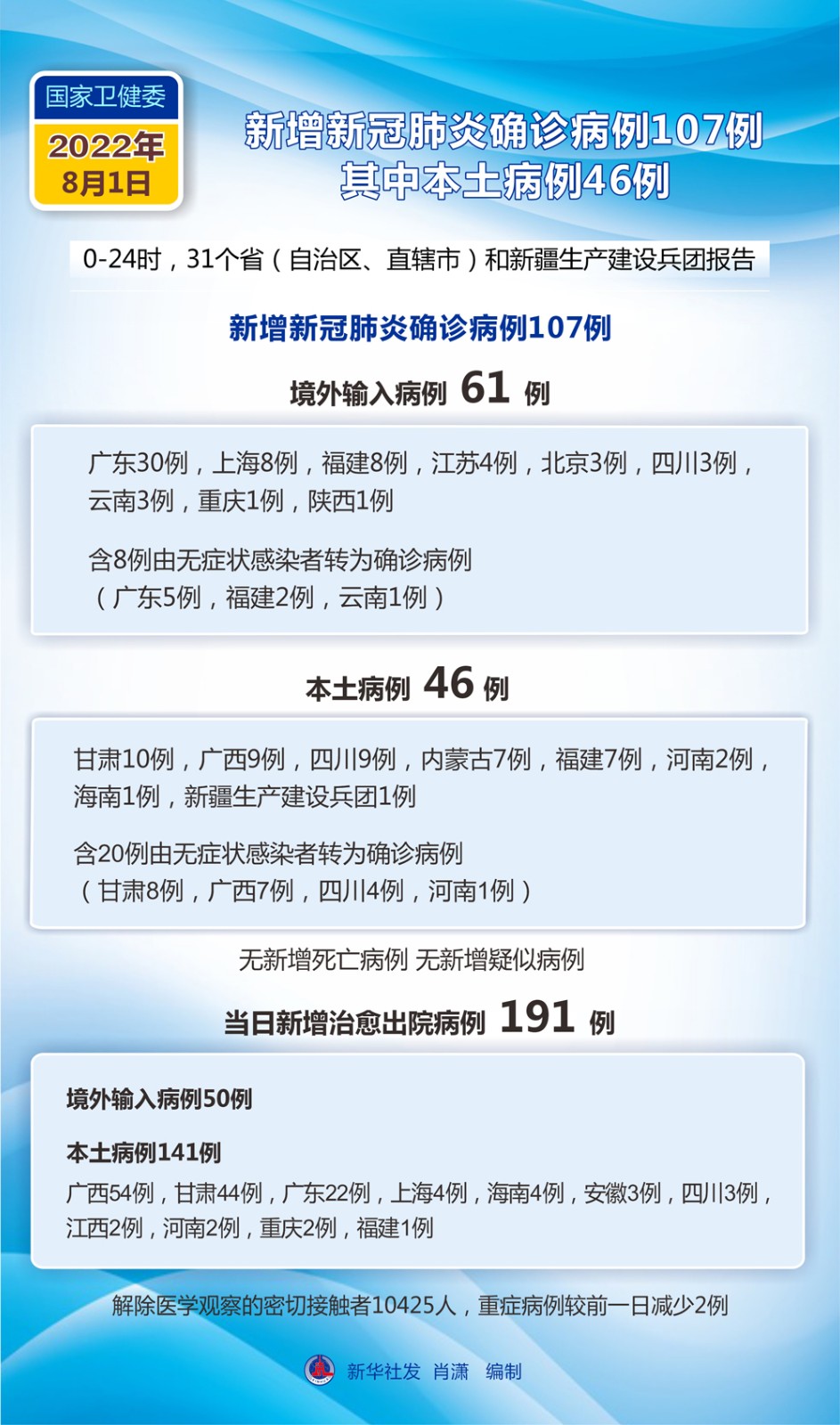 (圖表)國(guó)家衛(wèi)健委:8月1日新增新冠肺炎確診病例107例 其中本土病例46例