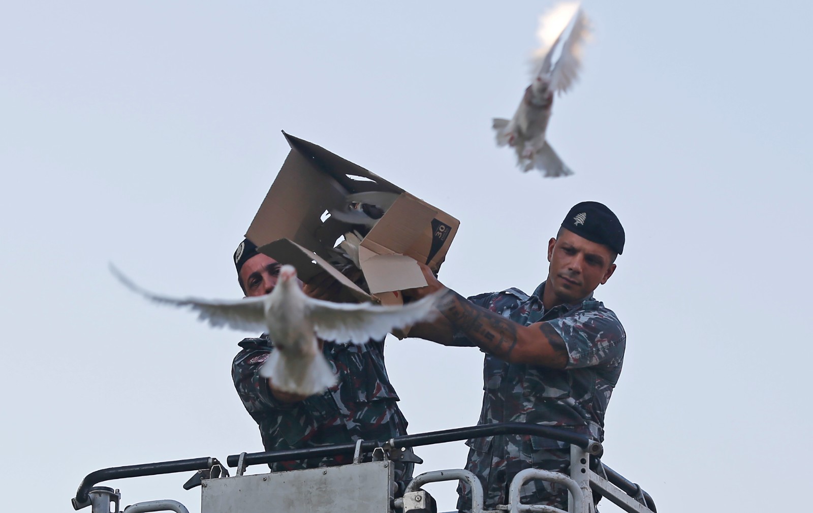 8月3日,在黎巴嫩貝魯特,人們放飛白鴿,紀念貝魯特港口大爆炸中犧牲的消防人員。