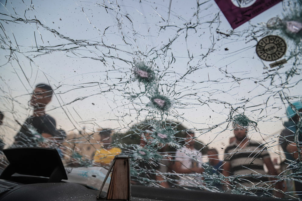 8月7日,人們在加沙城查看一輛在以色列空襲中損毀的汽車。