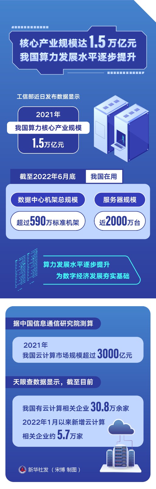 工信部近日發(fā)布數(shù)據(jù)顯示,2021年,我國算力核心產(chǎn)業(yè)規(guī)模達1.5萬億元。截至2022年6月底,我國在用數(shù)據(jù)中心機架總規(guī)模超過590萬標(biāo)準(zhǔn)機架,服務(wù)器規(guī)模近2000萬臺。算力發(fā)展水平逐步提升,為數(shù)字經(jīng)濟發(fā)展夯實基礎(chǔ)。