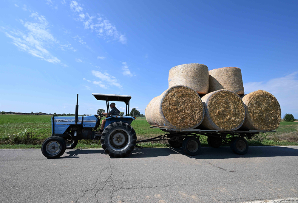 8月12日,在意大利倫巴第大區(qū)曼托瓦,農(nóng)民運(yùn)送草垛。