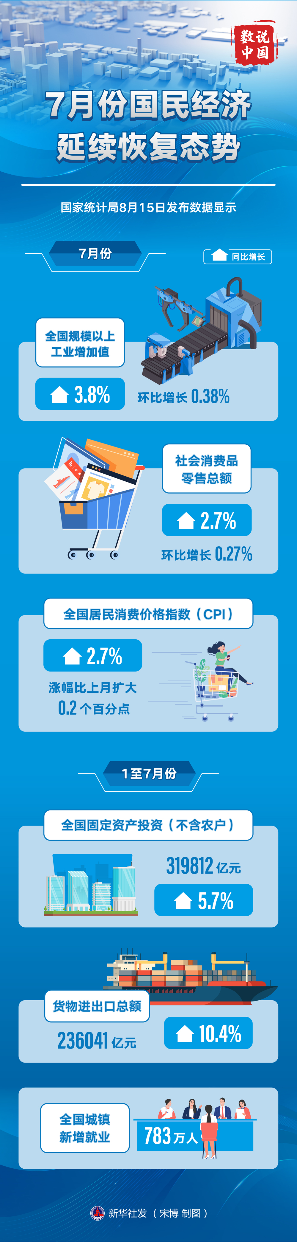 國(guó)家統(tǒng)計(jì)局8月15日發(fā)布數(shù)據(jù)顯示,7月份,生產(chǎn)供給繼續(xù)恢復(fù),就業(yè)物價(jià)總體平穩(wěn),對(duì)外貿(mào)易增勢(shì)良好,民生保障有力有效,國(guó)民經(jīng)濟(jì)延續(xù)恢復(fù)態(tài)勢(shì)。