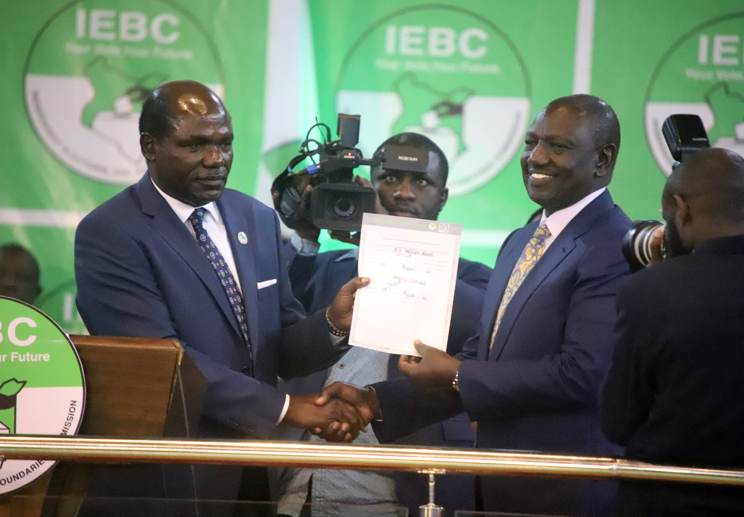 8月15日,肯尼亞獨(dú)立選舉和邊界委員會(huì)主席瓦富拉·切布卡蒂(前左)在內(nèi)羅畢國(guó)家計(jì)票中心向威廉·魯托頒發(fā)證書(shū)。