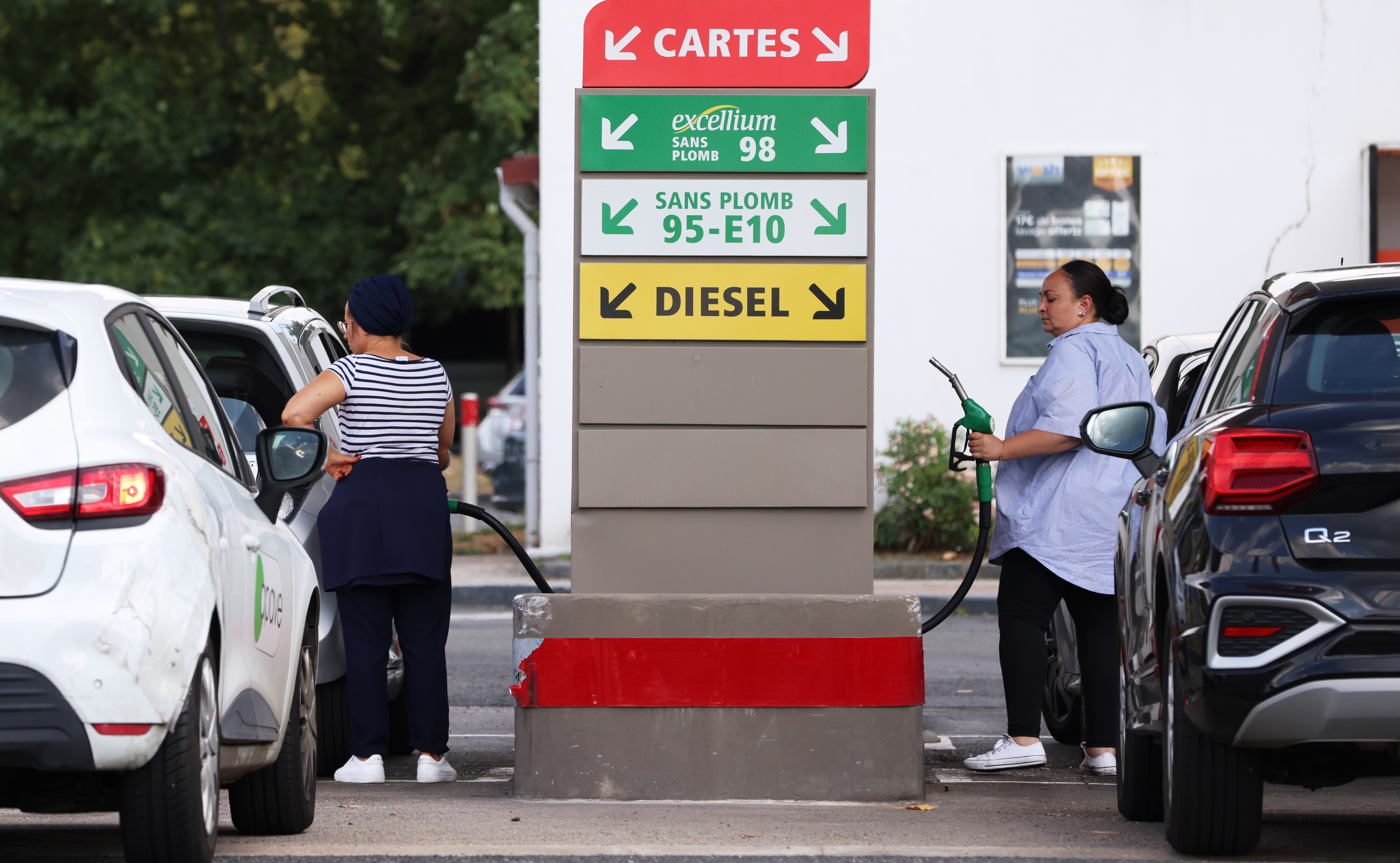 8月18日, 人們在法國巴黎郊區(qū)的一處加油站加油。