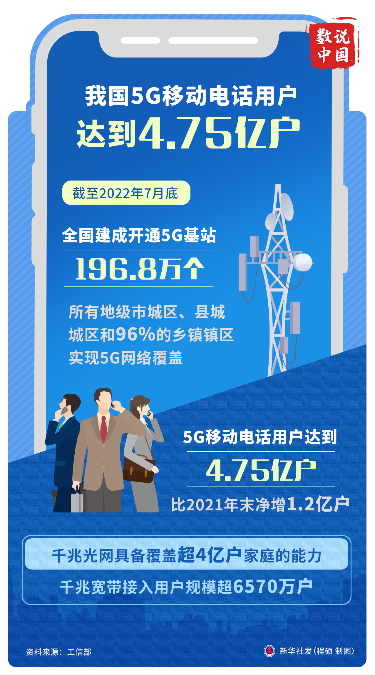 工信部信息通信發(fā)展司司長謝存8月19日表示,截至7月底,全國建成開通5G基站196.8萬個(gè),所有地級市城區(qū)、縣城城區(qū)和96%的鄉(xiāng)鎮(zhèn)鎮(zhèn)區(qū)實(shí)現(xiàn)5G網(wǎng)絡(luò)覆蓋,5G移動(dòng)電話用戶達(dá)到4.75億戶,比2021年末凈增1.2億戶,千兆光網(wǎng)具備覆蓋超4億戶家庭的能力,千兆寬帶接入用戶規(guī)模超6570萬戶。