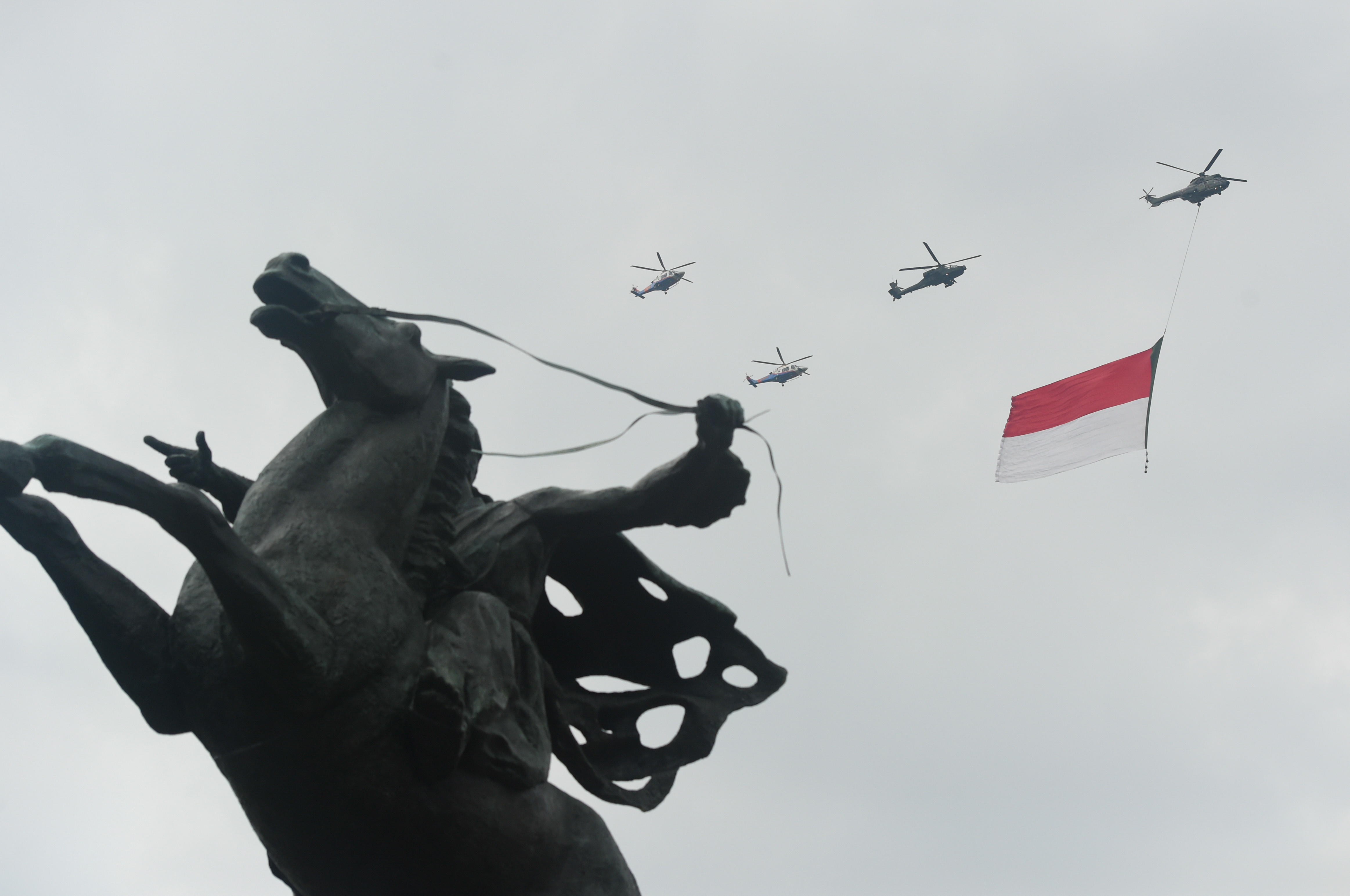 8月17日,懸掛印度尼西亞國旗的飛機(jī)編隊(duì)飛過首都雅加達(dá)上空。