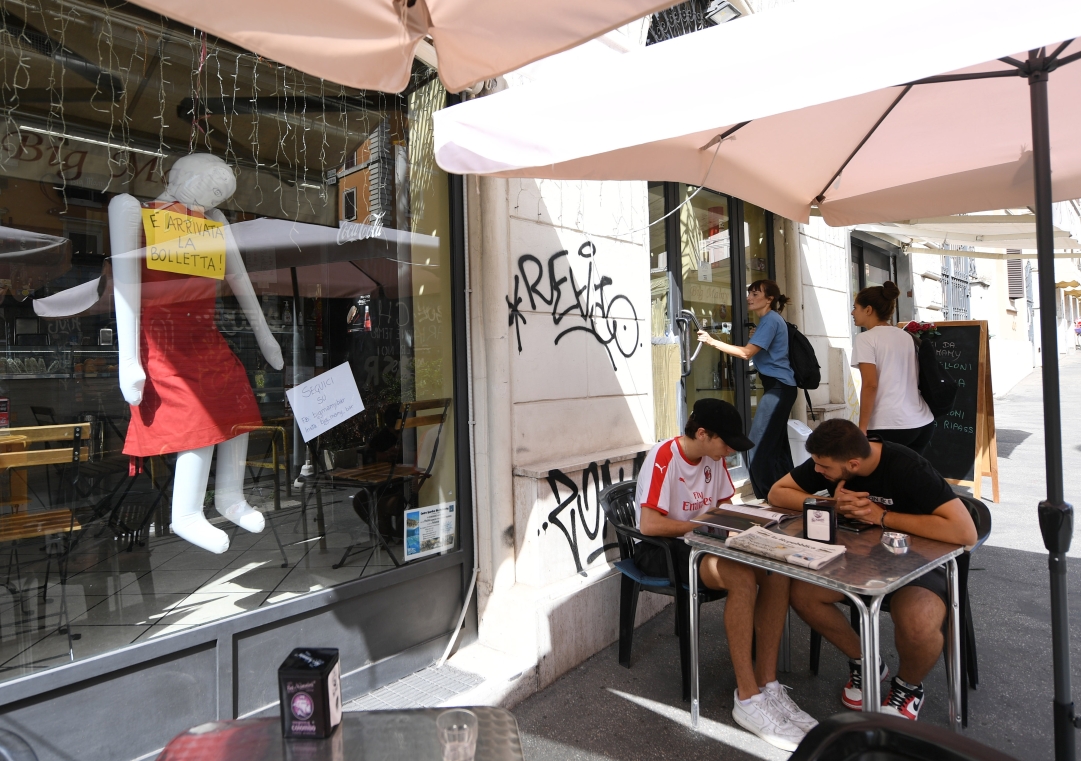 近日,意大利羅馬一家餐館的玻璃窗上懸掛著一個(gè)充氣人偶,它身前的紙牌上寫著醒目的“賬單已到!”字樣,吸引著人們的目光。這家餐館的經(jīng)營者勞拉·拉莫尼說,此舉的起因是餐館近期面臨的高額電費(fèi)賬單。今年6月和7月,餐館的電費(fèi)賬單共計(jì)約2600歐元,而去年同期約為900歐元。勞拉表示賬單令她不堪重負(fù),為了維持經(jīng)營,她不得不辭去兩名員工,上調(diào)部分商品價(jià)格,并申請分期支付賬單。
