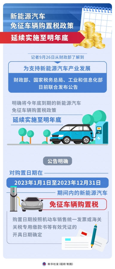 記者9月26日從財政部了解到,為支持新能源汽車產(chǎn)業(yè)發(fā)展,財政部、國家稅務總局、工業(yè)和信息化部日前聯(lián)合發(fā)布公告,明確將今年底到期的新能源汽車免征車輛購置稅政策,延續(xù)實施至明年底。