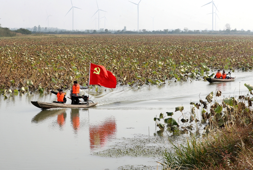 10月31日,在湖北省沙洋縣借糧湖水域,沙洋縣公安局毛李水陸派出所河湖警長(zhǎng)與村干部開(kāi)展生態(tài)保護(hù)例行巡查。今年以來(lái),沙洋縣公安局推進(jìn)河湖警長(zhǎng)工作機(jī)制,在漢江、長(zhǎng)湖等江河湖泊開(kāi)展生態(tài)環(huán)境保護(hù)巡查,嚴(yán)厲打擊污染環(huán)境、非法捕撈、非法采砂等違法犯罪,為保護(hù)生態(tài)環(huán)境筑牢法治屏障。