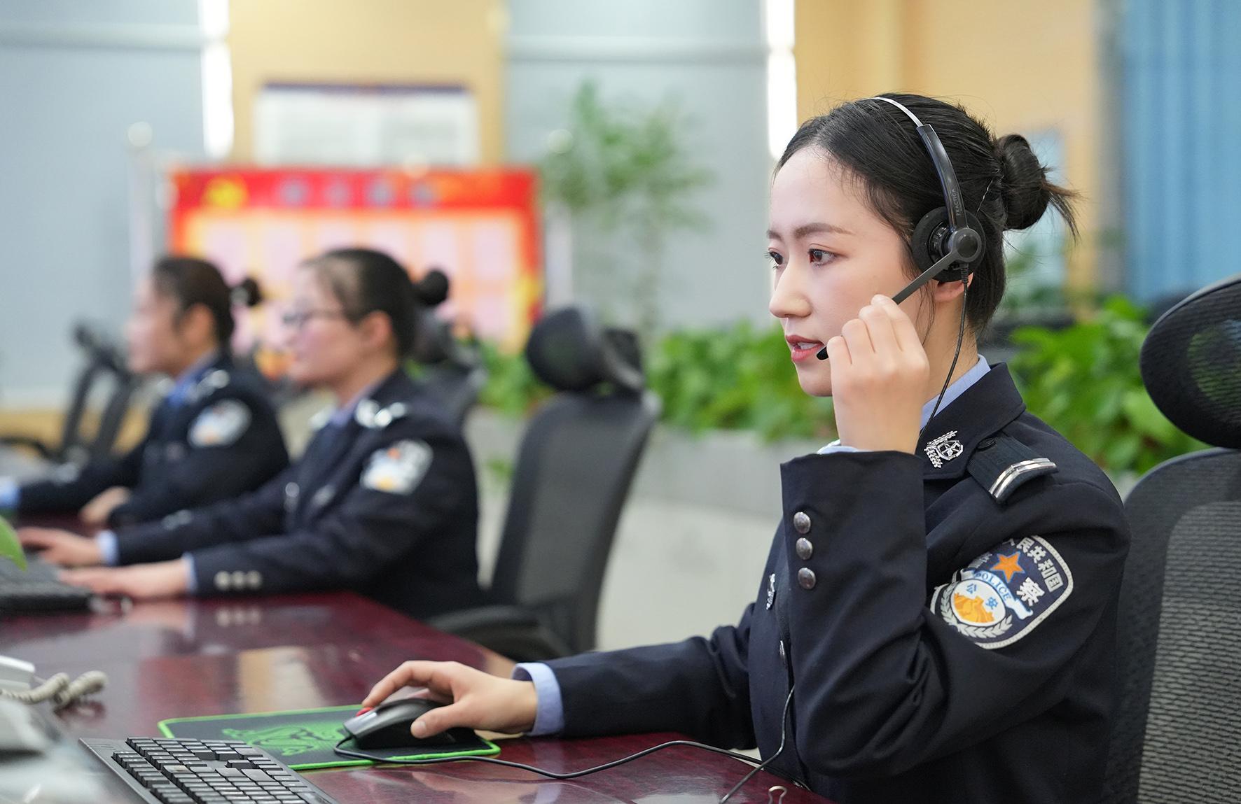 3月8日,陜西省渭南市合陽縣公安局指揮中心大廳,女民警李朵和同事們在崗位上度過自己的節(jié)日。