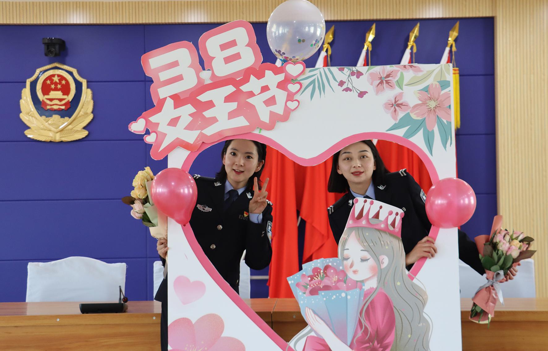 3月8日,遼寧省阜新市公安局交警支隊(duì)海州大隊(duì)的女民警、女輔警在崗位上度過“三八”節(jié)。