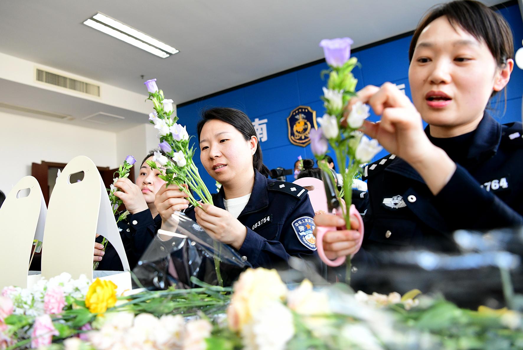 3月7日,安徽省阜南縣公安局女民輔警在花藝?yán)蠋煹闹笇?dǎo)下插花。為慶?!叭恕眹H婦女節(jié),阜南縣公安局舉辦“學(xué)花藝 慶節(jié)日”活動。