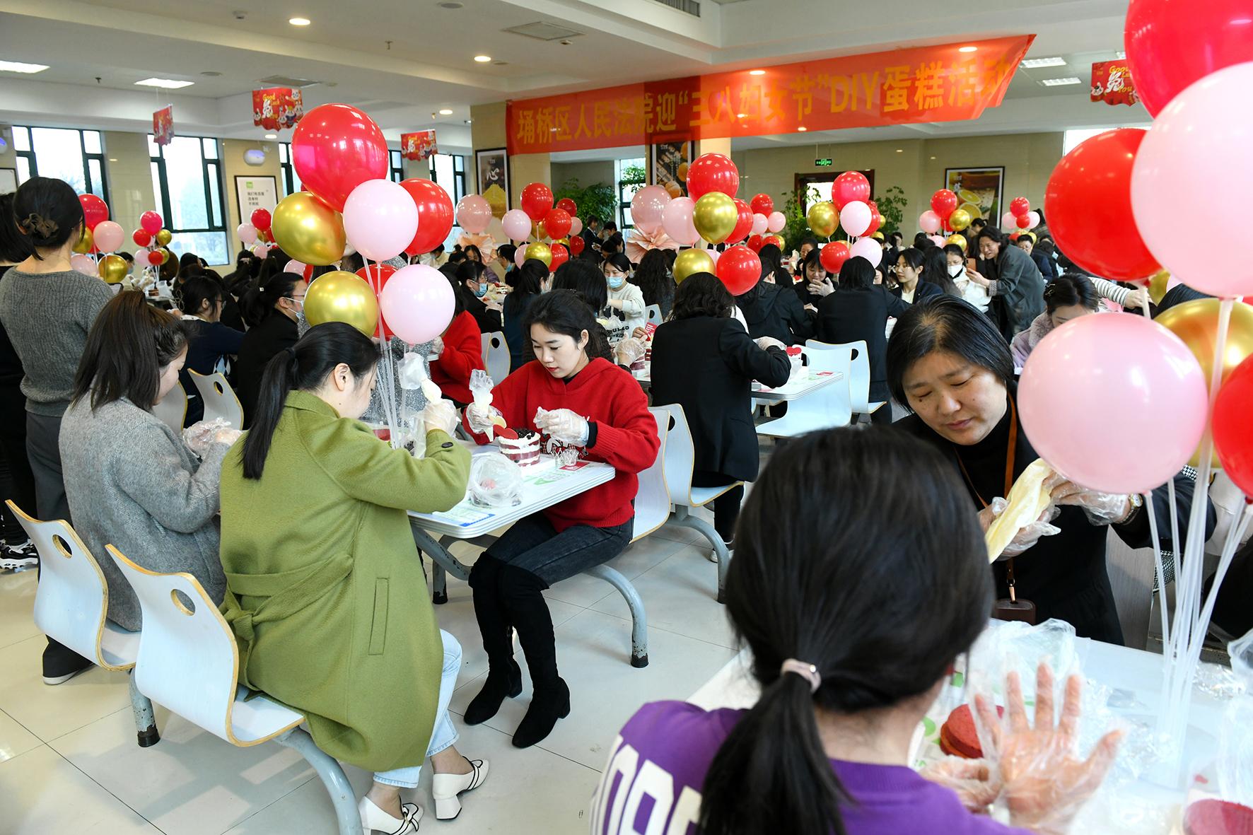 3月7日,安徽省宿州市埇橋區(qū)人民法院工會組織全體女干警舉辦迎“三八”主題活動,女干警和后勤人員在糕點(diǎn)技師帶領(lǐng)下學(xué)習(xí)蛋糕制作技藝。