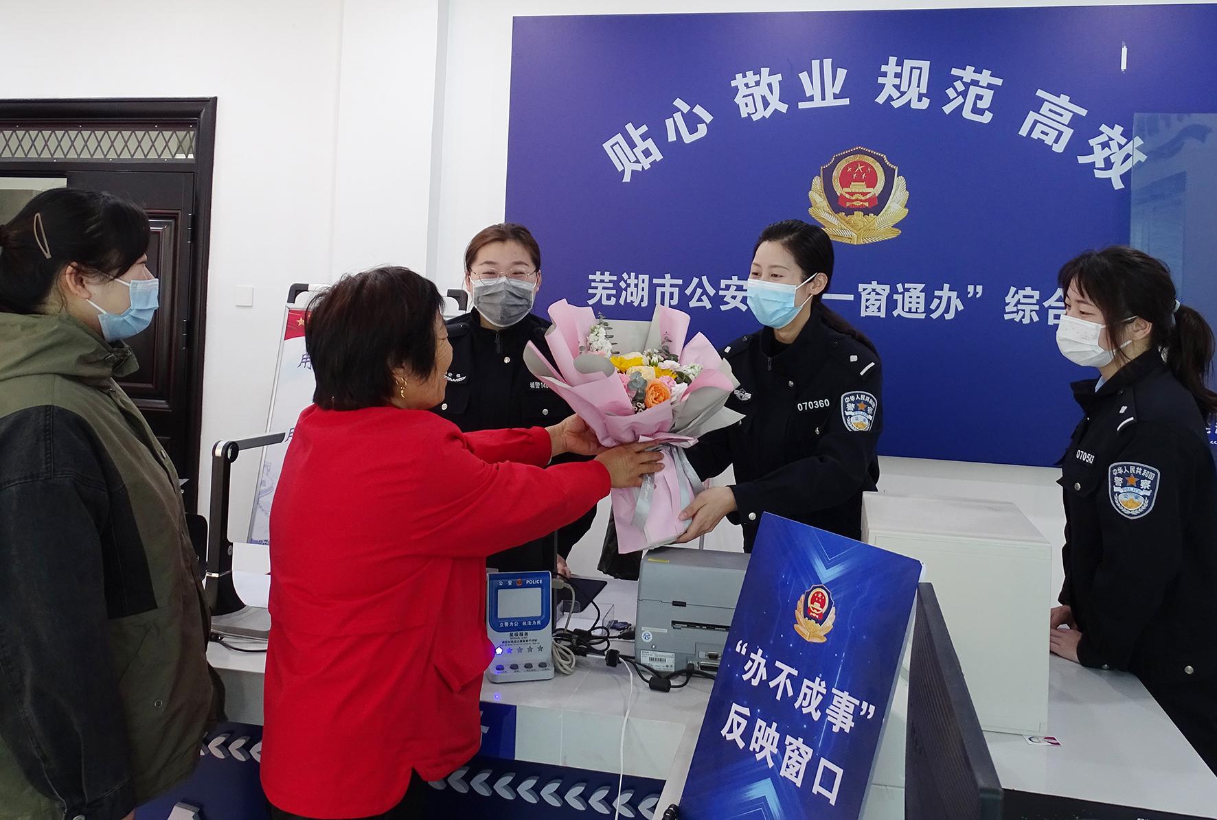“你們辛苦啦!”3月8日,安徽省蕪湖市公安局鏡湖分局赭麓派出所戶籍室,群眾將鮮花獻(xiàn)給女民警、女輔警,向奮戰(zhàn)在一線的她們致以節(jié)日的問候。
