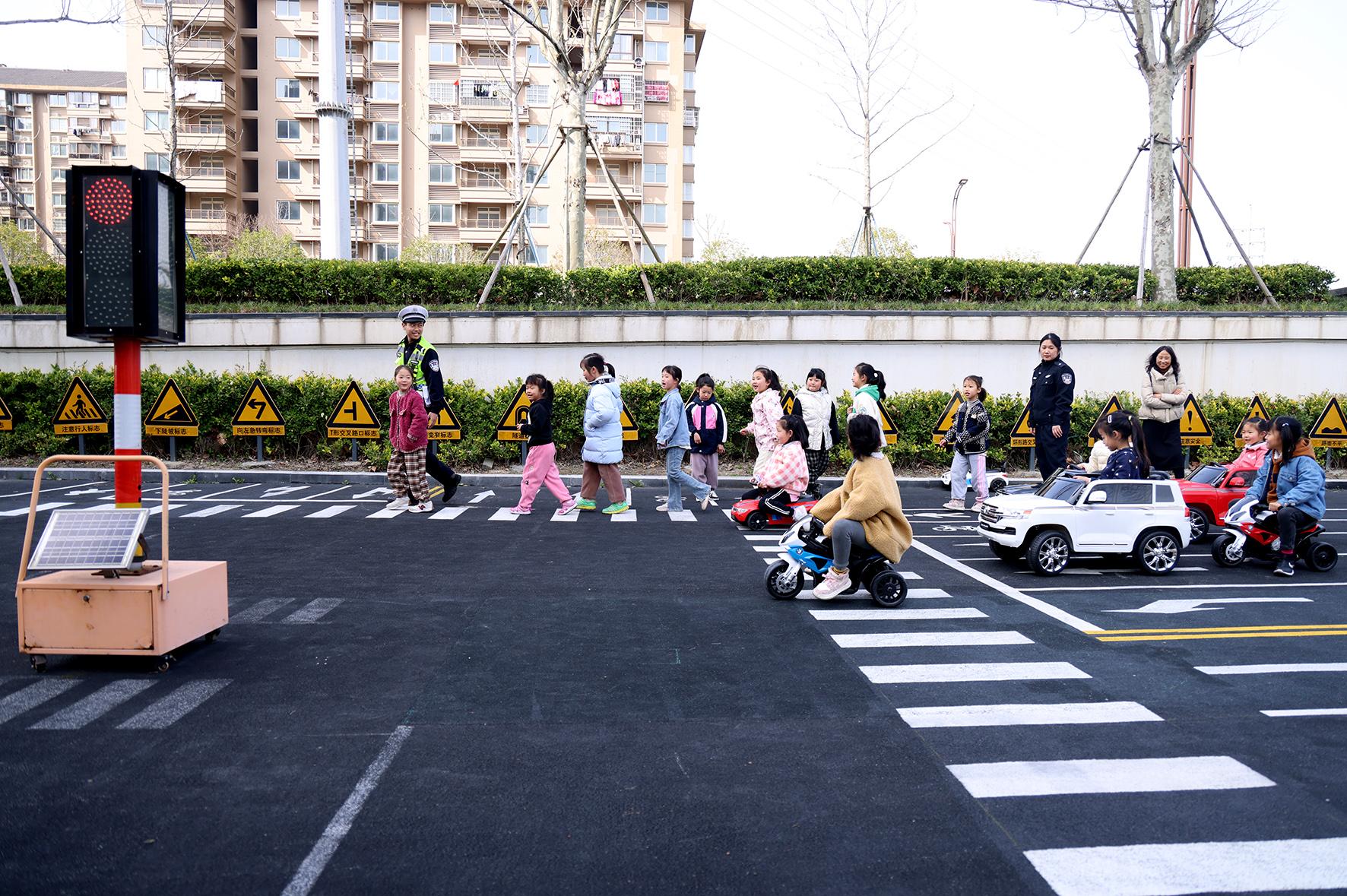 圖為民警帶學(xué)生沉浸式模擬體驗(yàn)安全通過(guò)十字路口。