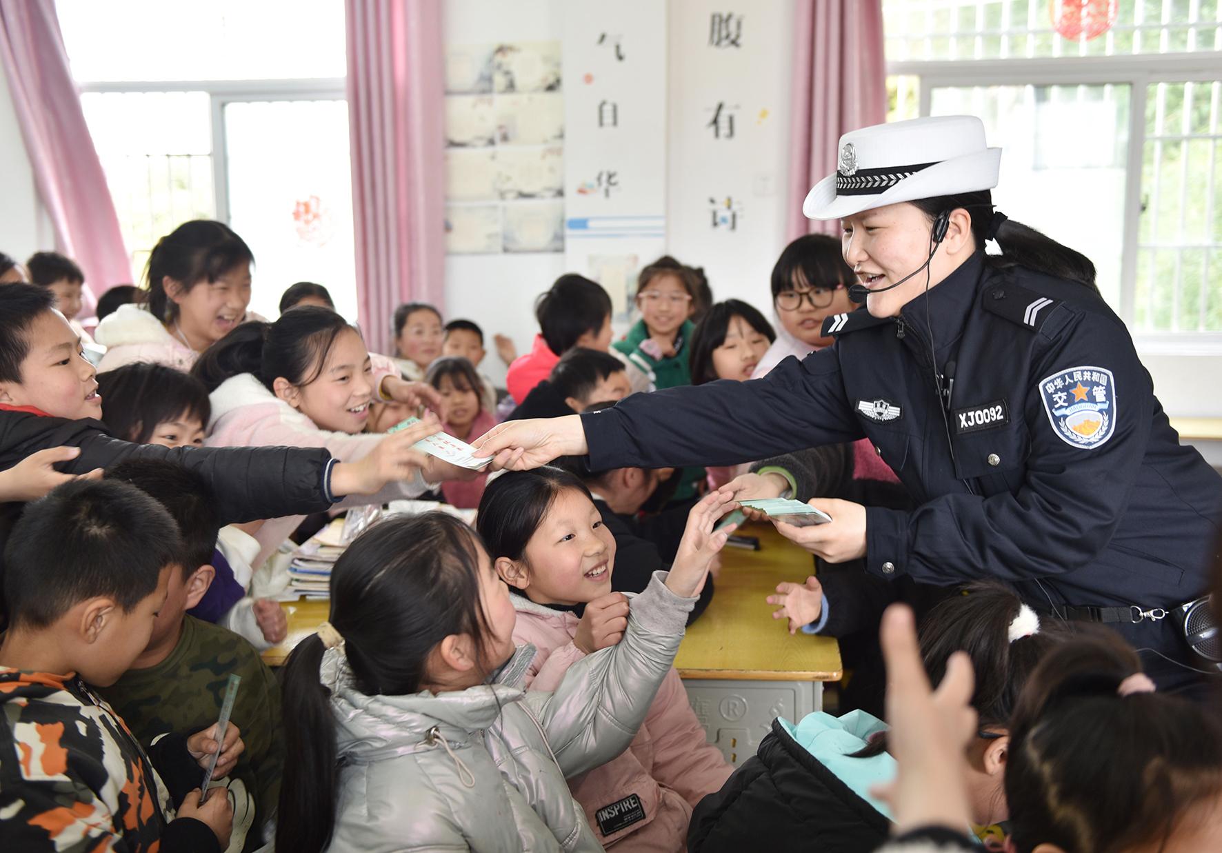 3月26日,安徽省阜南縣公安局交管大隊(duì)民警在黃崗鎮(zhèn)靳成學(xué)校與學(xué)生們互動(dòng)交通安全知識(shí)。