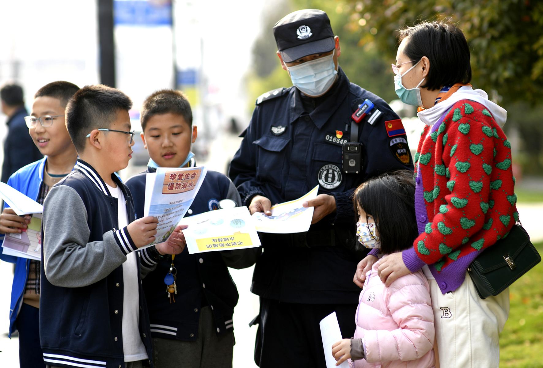 3月26日,河南省鄭州市公安局金水分局巡特警隊(duì)員在街頭開(kāi)展“中小學(xué)生安全教育”活動(dòng)。