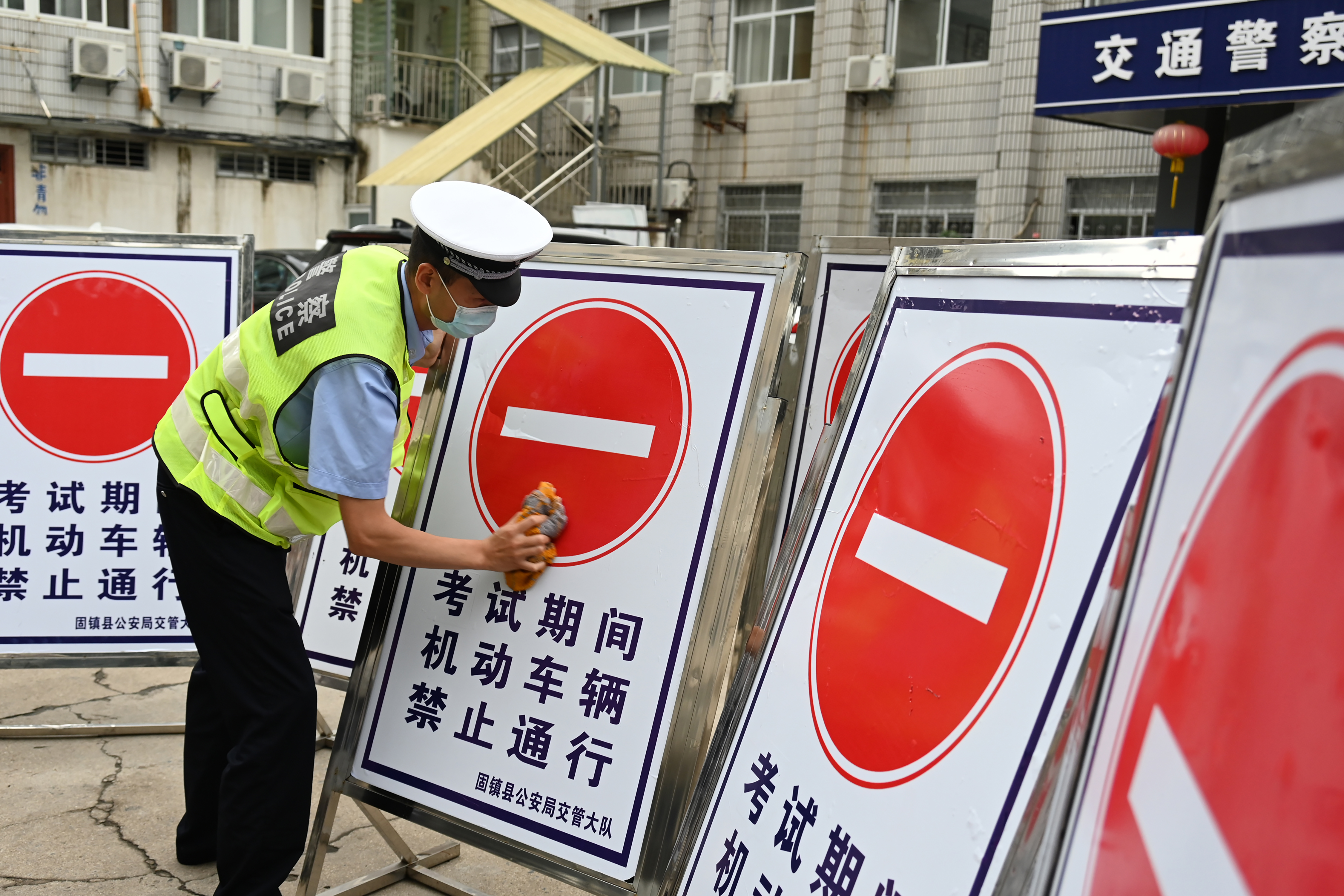 6月5日,安徽省固鎮(zhèn)縣公安局交管大隊(duì)民警在清潔高考交通管制警示牌。為保障高考期間道路交通安全,固鎮(zhèn)縣公安局交管大隊(duì)提前部署,全力服務(wù)高考。