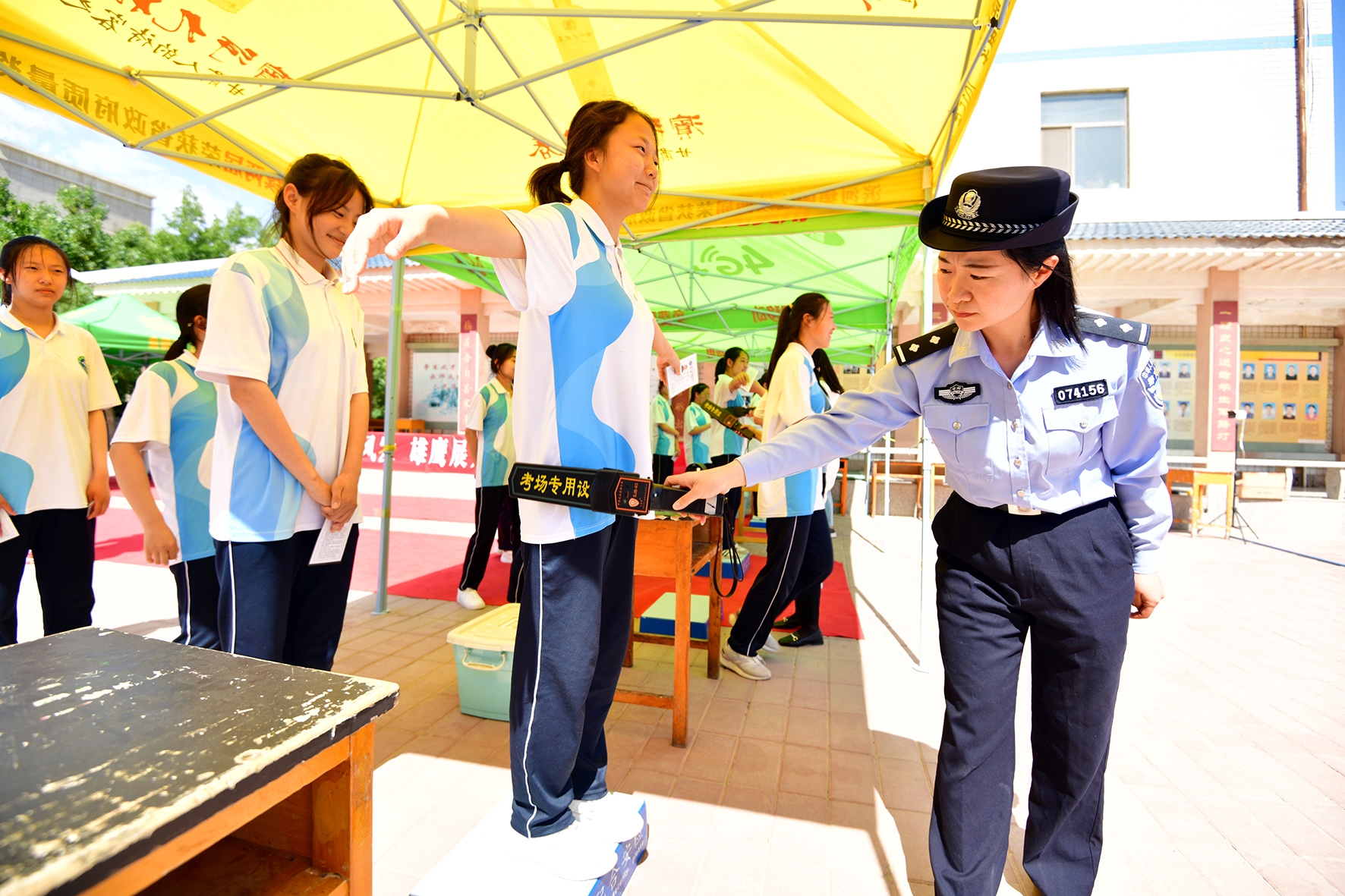 6月6日,甘肅省臨澤縣公安局開發(fā)區(qū)派出所民輔警組織轄區(qū)高三年級(jí)全體學(xué)生進(jìn)行高考安檢規(guī)范演練,幫助考生提前熟悉高考入場(chǎng)流程。