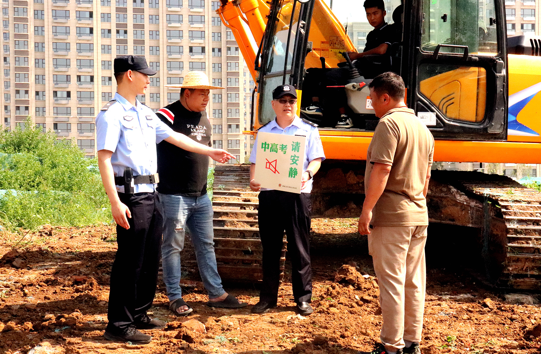 6月6日,山東省棗莊市公安局嶧城分局壇山派出所民警在施工工地宣講高考期間禁止施工和降噪降音注意事項(xiàng)。