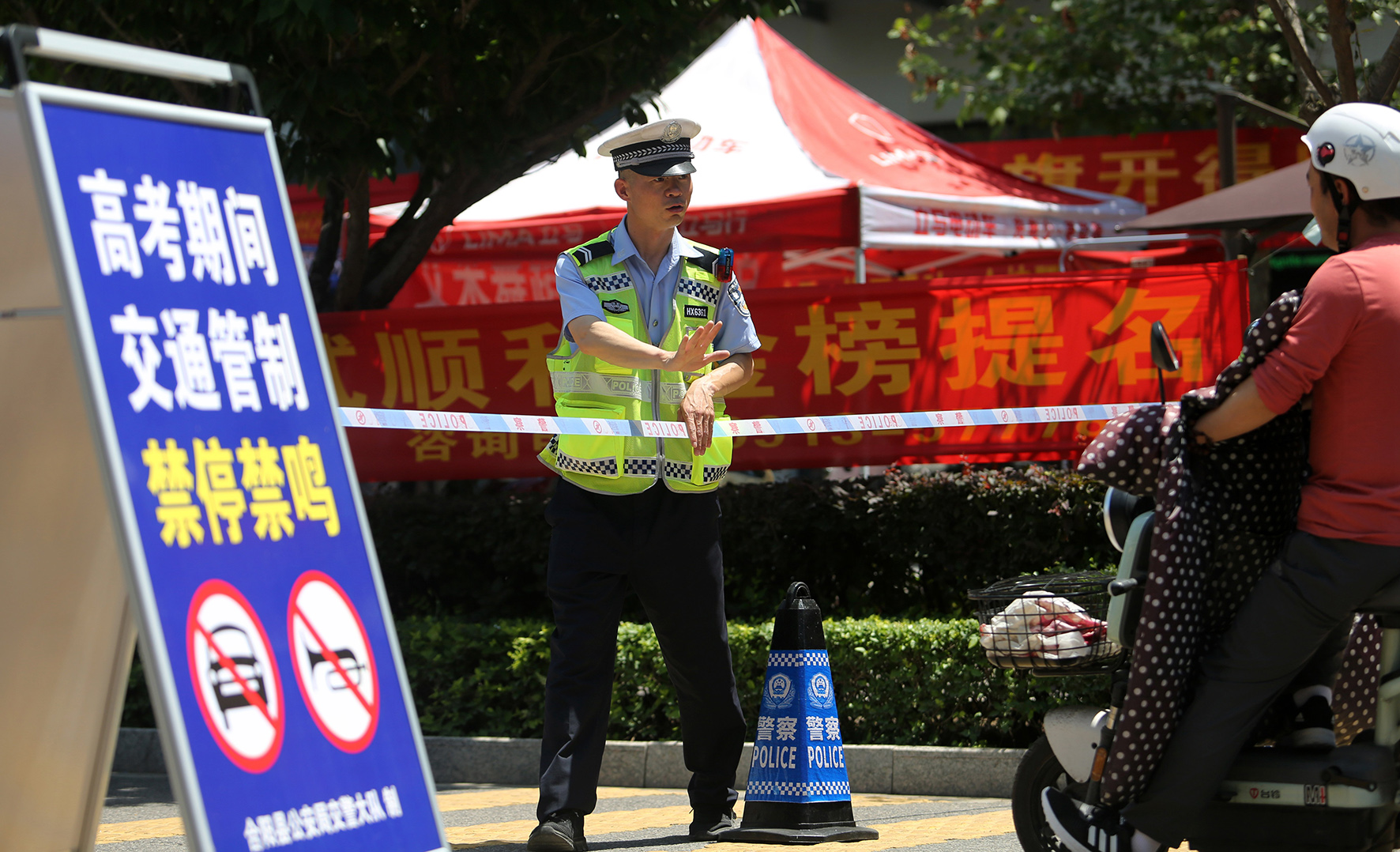 6月6日,陜西省渭南市合陽縣公安局交通管理大隊(duì)民警在合陽中學(xué)考點(diǎn)外擺放交通標(biāo)志牌,并提醒群眾高考期間請(qǐng)繞行。