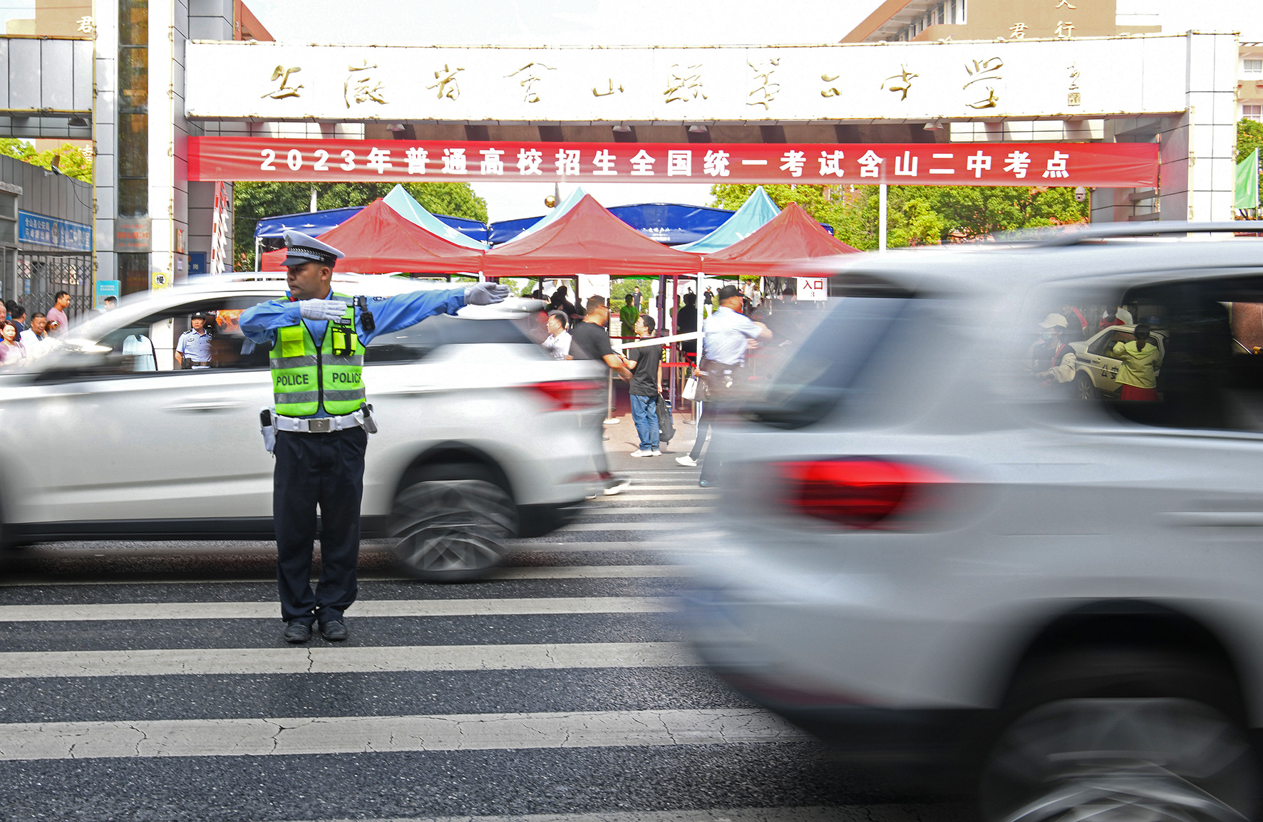 6月7日,安徽省含山縣公安局民輔警在轄區(qū)高考路段主要路口設(shè)崗,及時(shí)疏導(dǎo)交通擁堵,保障考點(diǎn)周邊道路交通秩序。