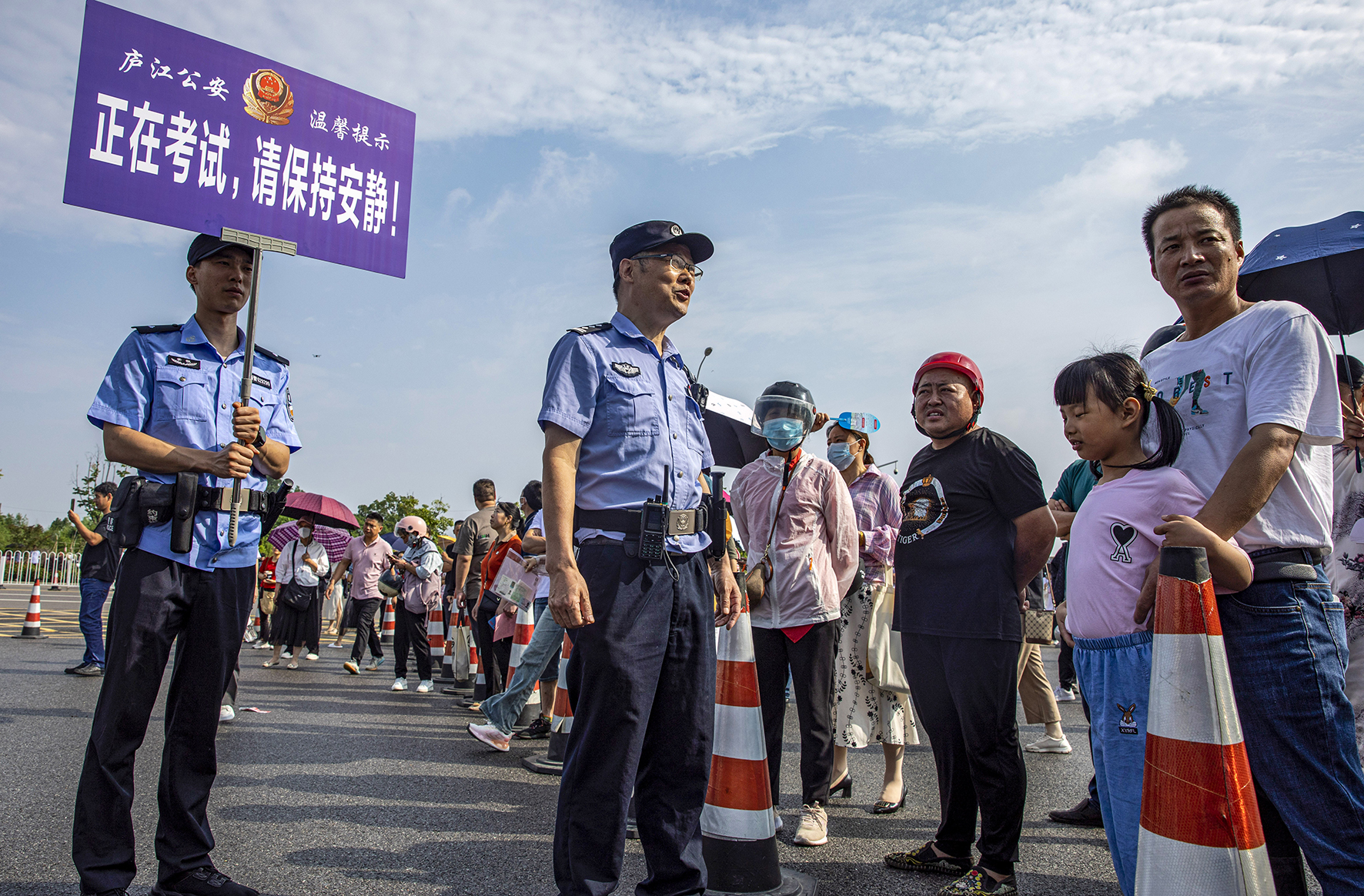 6月7日,河南省鄭州市公安局金水分局巡特警隊(duì)員及轄區(qū)派出所民輔警在考場(chǎng)入口處護(hù)航高考服務(wù)考生和家長。