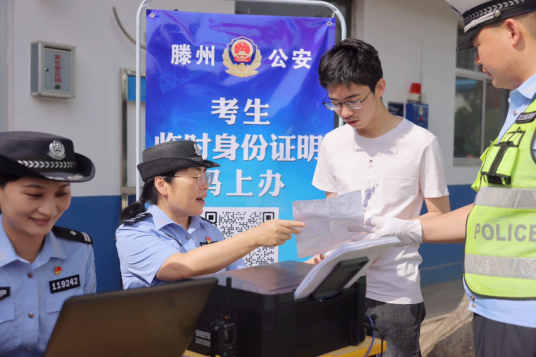 6月7日,山東省滕州市公安局民警為考試前居民身份證丟失、損壞的考生,開辟高考“綠色通道”,提供身份信息核實(shí)、出具臨時(shí)身份證明服務(wù)。