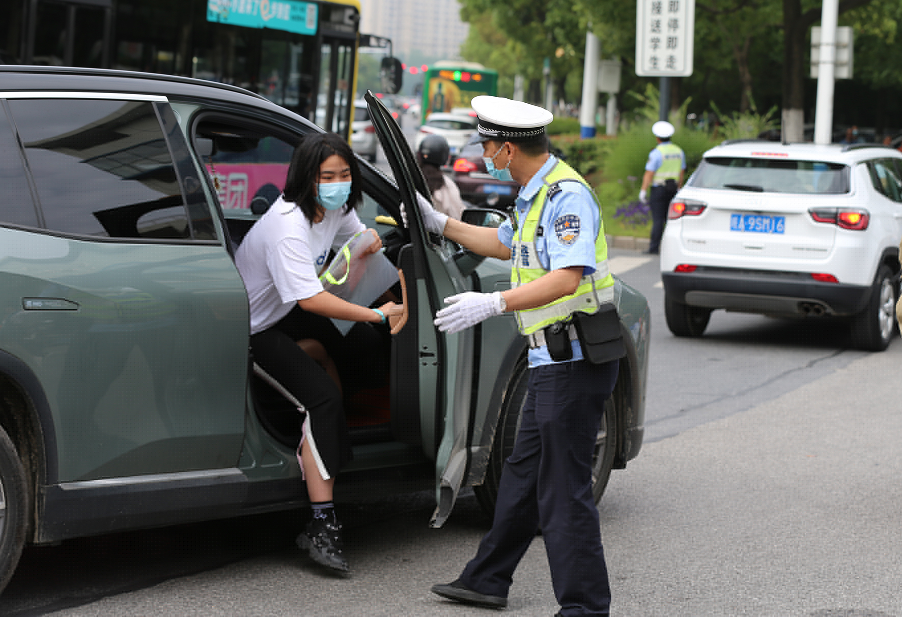6月7日,安徽省合肥市公安局交警支隊(duì)民警在第八中學(xué)考點(diǎn)引導(dǎo)送考車輛,同時(shí)為考生及家長提供便民服務(wù)。