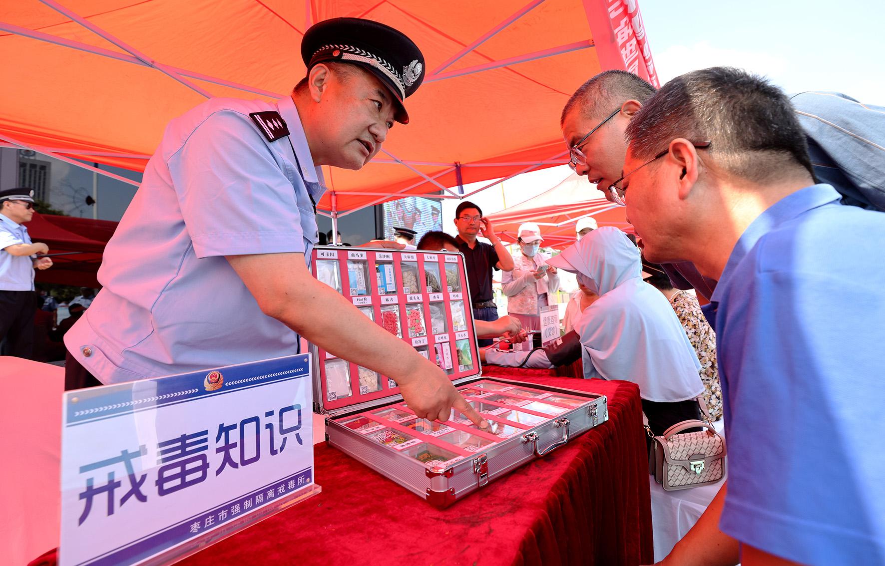 6月26日,山東省棗莊市公安、司法等部門在光明廣場開展以“健康人生 綠色無毒”為主題的禁毒宣傳活動。