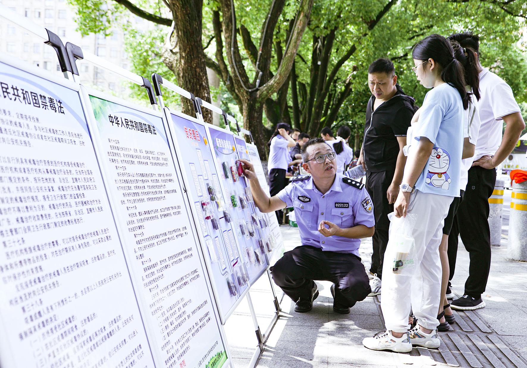 6月25日,河南省鄭州市公安局金水分局巡特警隊員與禁毒民警在文博廣場開展禁毒宣傳活動。