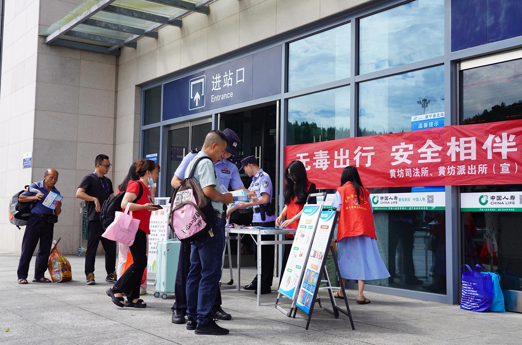 6月26日,福建省建寧縣公安局黃坊派出所聯(lián)合黃坊司法所、黃坊鄉(xiāng)政府等單位在北動車站廣場開展以“無毒出行 安全相伴”為主題的禁毒宣傳活動。