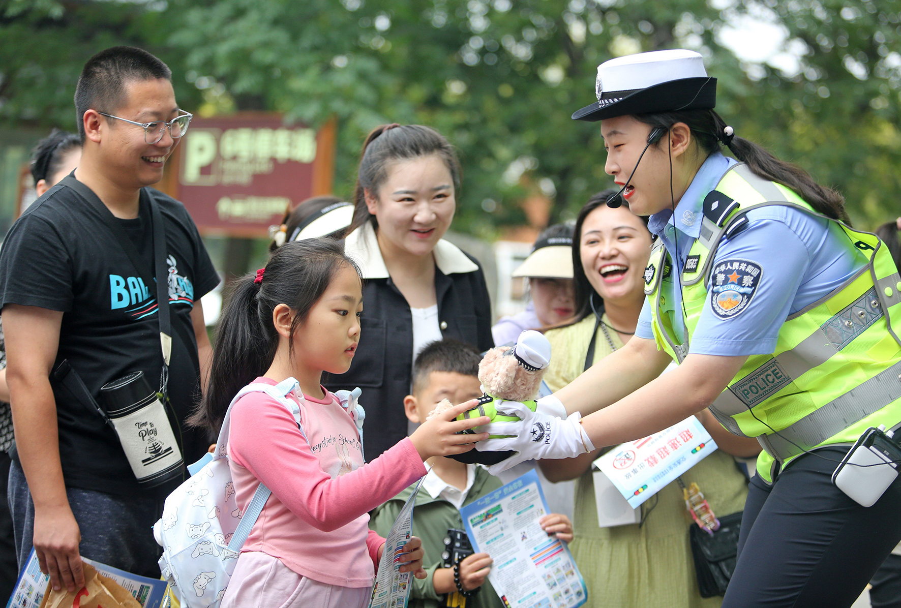 8月24日,陜西省華陰市華山景區(qū)廣場(chǎng),民警為回答對(duì)問題的小朋友贈(zèng)送“交警小熊”。當(dāng)日,“全國(guó)百城百臺(tái)100小時(shí)”直播聯(lián)動(dòng)陜西站第九場(chǎng)活動(dòng)走進(jìn)渭南華陰市、潼關(guān)縣?;顒?dòng)以“文明‘陜’亮出行·安全暢游三秦——暢行中國(guó)·百城百臺(tái)夏季說安全”為主題,通過直播聯(lián)動(dòng),全媒體矩陣宣講交通安全知識(shí),傳遞交通文明理念。