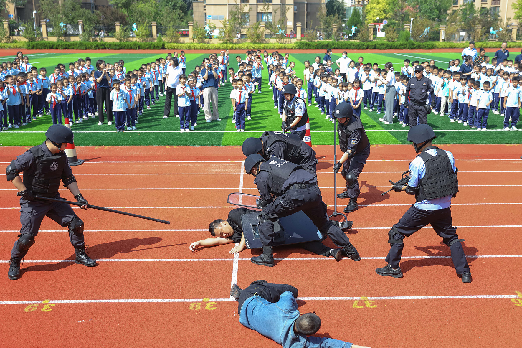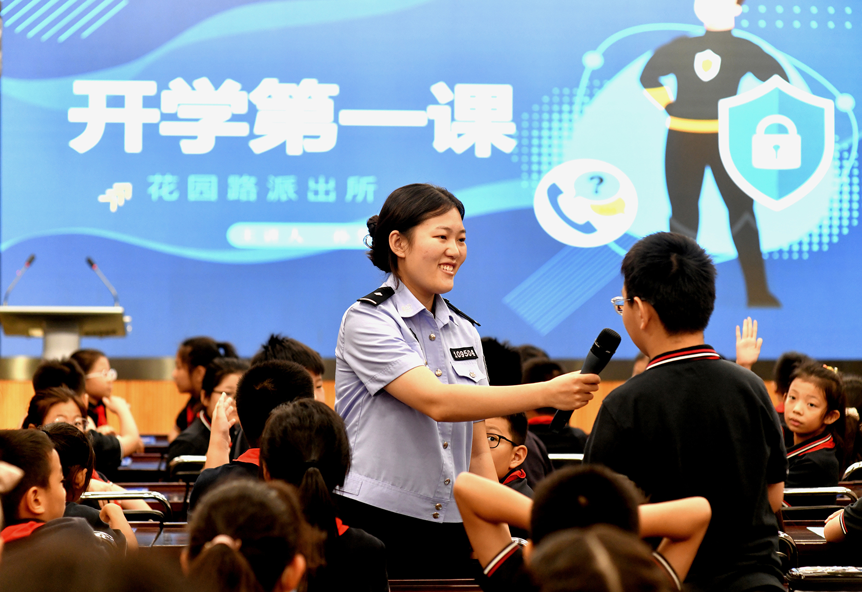 8月30日,河南省鄭州市公安局金水分局巡特警與花園路派出所的民輔警為轄區(qū)學(xué)校師生開(kāi)展上好“開(kāi)學(xué)第一課”活動(dòng)。
