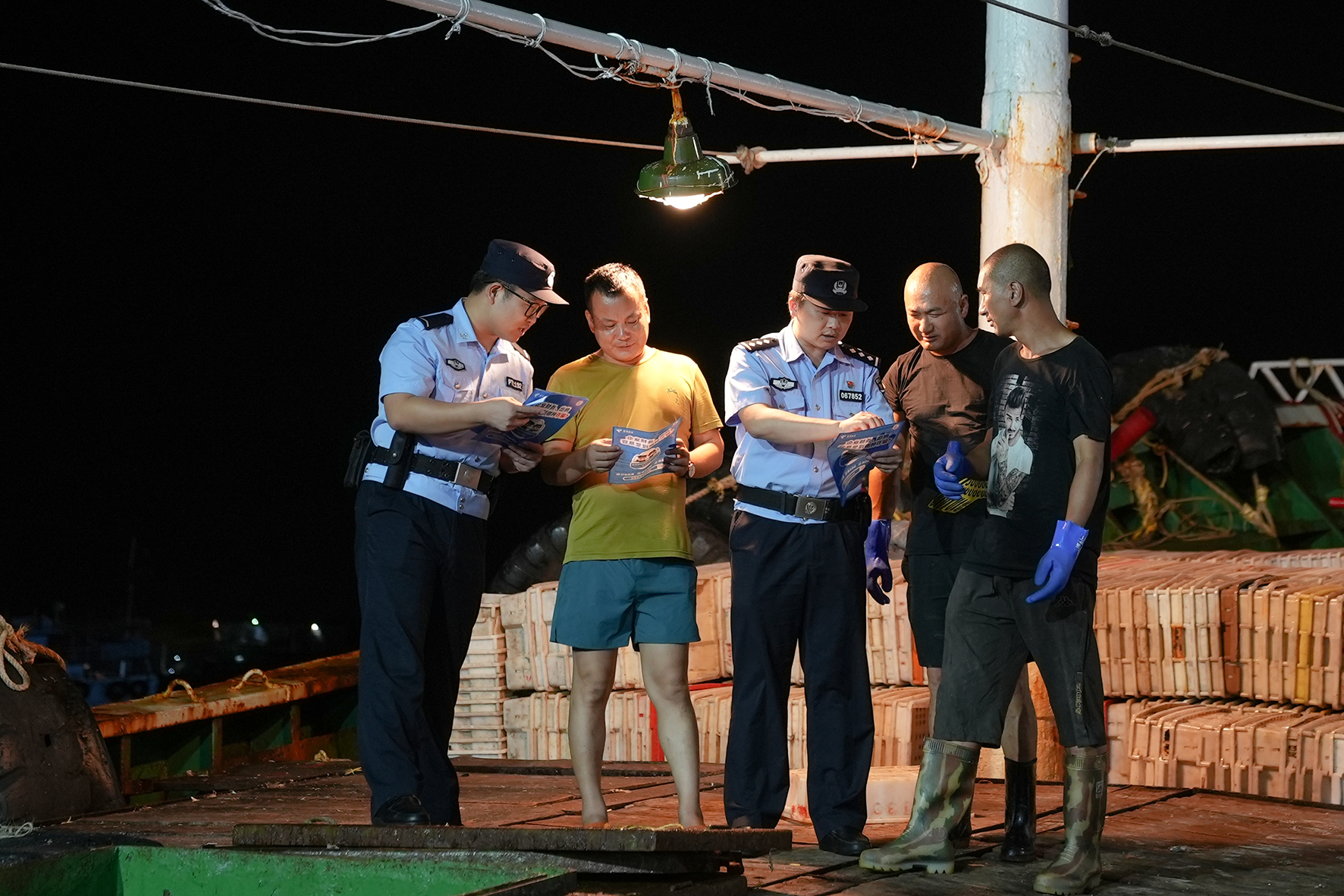 圖為9月19日晚,民警向正在船上作業(yè)的漁民開(kāi)展安全防范宣傳。