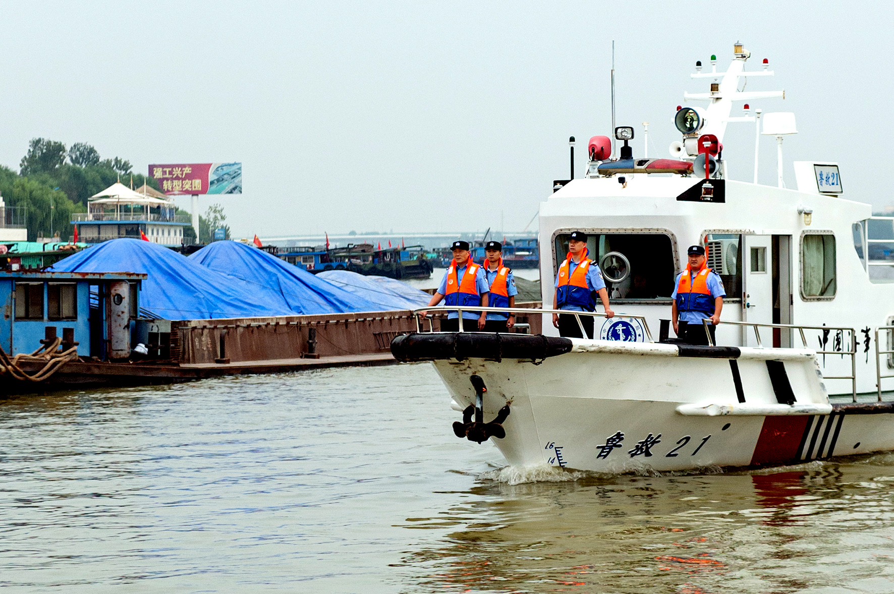 9月28日,山東省棗莊市公安局臺兒莊分局水上派出所民警在運河航道進行水域巡邏。
