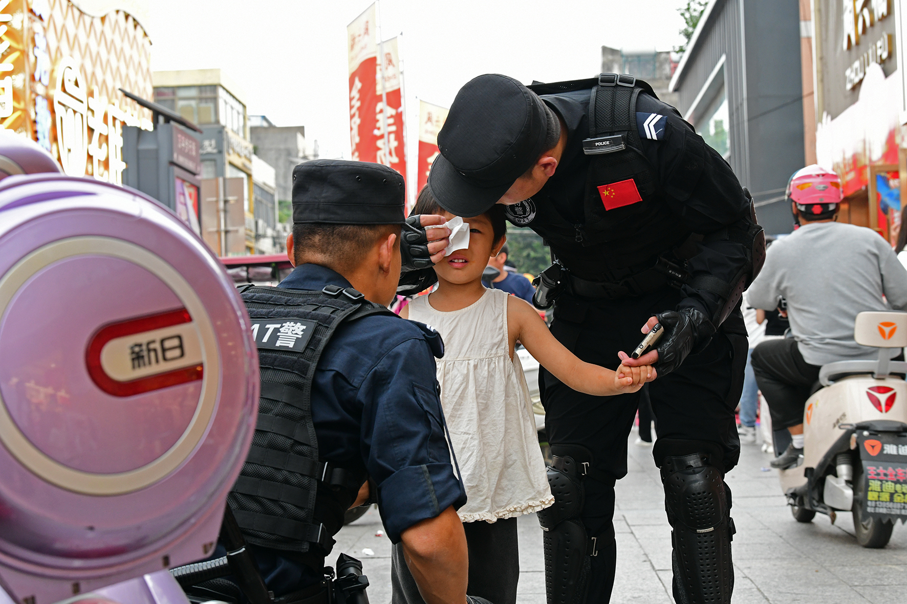 10月1日,安徽省阜南縣巡防大隊(duì)民輔警在城區(qū)萬(wàn)宇商業(yè)街區(qū)巡邏時(shí)發(fā)現(xiàn)一名走失幼童。經(jīng)過(guò)半小時(shí)的尋找,終于在一地下商場(chǎng)內(nèi)通過(guò)喊話(huà)找到了幼童家人。